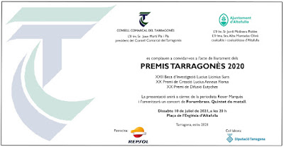 El dissabte 1 de juliol, a les 20 h, a Altafulla, tindrà lloc l'acte de lliurament dels Premis Tarragonès 2020 (no es va poder fer per la pandèmia). Durant el transcurs de l'acte es lliuraran:
